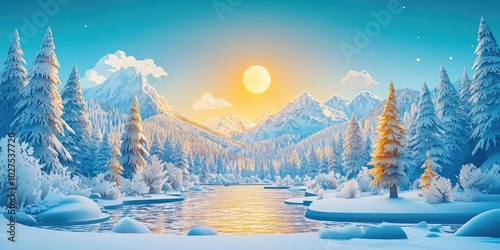 Sunlit snowy mountains and forests amidst the alpine landscape, Snowy mountains and forests in a sunlit alpine landscape