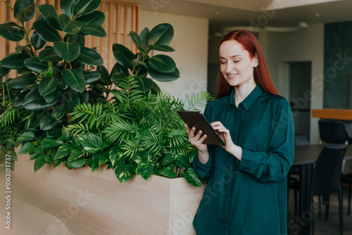 Smiling redhead businesswoman working on tablet PC by plants in office