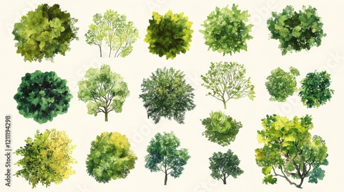 botanical landscape design elements, watercolor styled tree icons, varying foliage clusters, soft gradient greens, aerial garden planning symbols, organic canopy shapes, artistic vegetation marks,