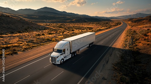 Autonomous vehicle testing concept. A white truck driving along a deserted highway surrounded by mountains and a golden landscape under a blue sky.