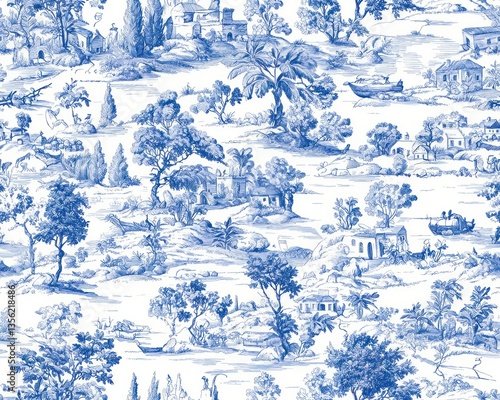 Elegant Blue and White Toile de Jouy Seamless Pattern Picturesque Landscape with Houses Trees and
