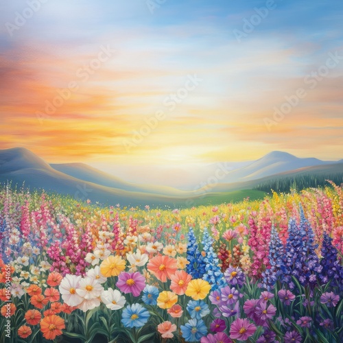 Joyful sunrise over vibrant flower fields nature landscape bright colors hyperrealistic oil painting
