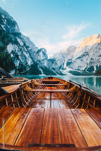 Wooden boat with paddles floating on turquoise water of calm lake on background of majestic landscape of highlands