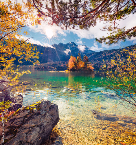 Landscape photography. Picturesque summer view of Eibsee lake with Zugspitze mountain range on background. Stunning autumn scene of Bavarian Alps, Germany. Beautiful autumn scenery.