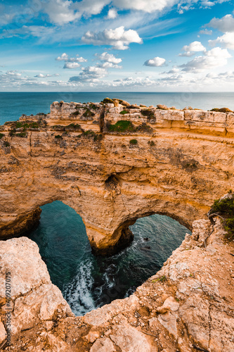 Heart-shaped cliffs on the shore of Atlantic ocean in Algarve, Portugal. Selective focus. Beautiful summer landscape.
