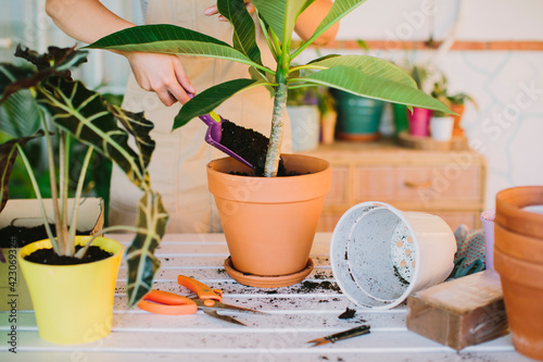Crop anonymous female adding soil into flowerpot with transplanted ficus plant while spending time in home garden