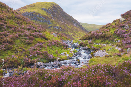 A colourful purple heather landscape and mountain stream along Tail Burn at Grey Mare's Tail waterfall near Moffat in the Scottish Borders, Scotland.