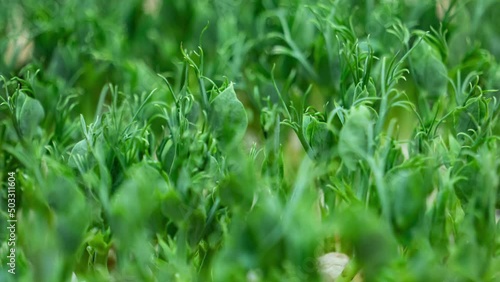 Micro greens pea plant sprouts growing time lapse. Peas micro greens close-up. Close up view of fresh green leaves.