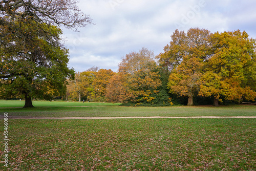 parkland landscape during autumn day. trees in fall colors at public park. open green space