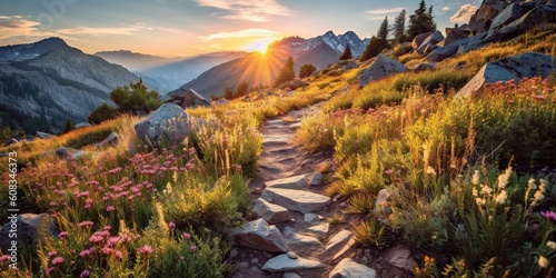 AI Generated. AI Generative. Beautiful flowers foliage mountain foliage path landscape adventure. Graphic Art
