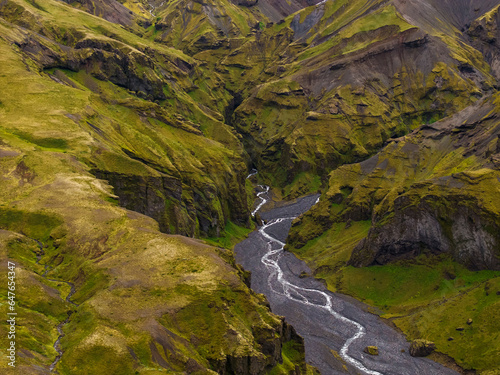 Aerial view of a river crossing the canyon in Hvolsvollur, Southern Region, Iceland.