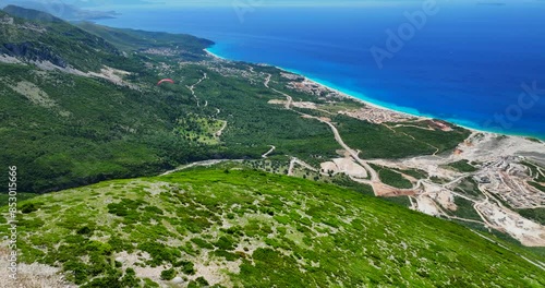 Aerial view of a paraglider over the Llogara landscape in the coast of Vlore, southern Albania.