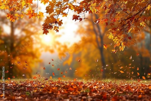 Beautiful autumn landscape with yellow trees and sun. Colorful foliage in the park. Falling leaves natural background