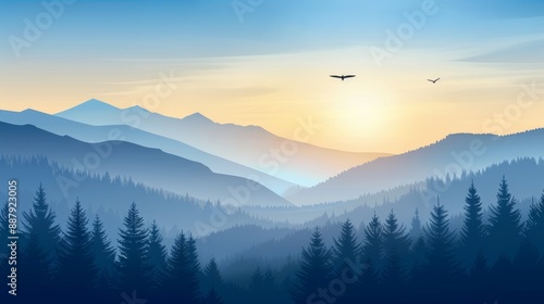 majestic mountain range at sunrise with silhouetted pines and flying birds in a misty blue landscape illustration