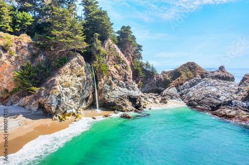 McWay Falls on Highway 1 and Big Sur along the Pacific Ocean coast, beautiful landscape and aerial view, sunset, sunrise, fog. Concept, travel, vacation, weekend