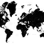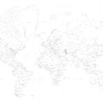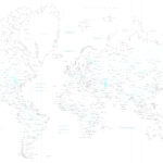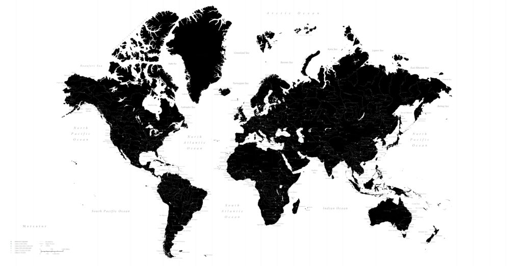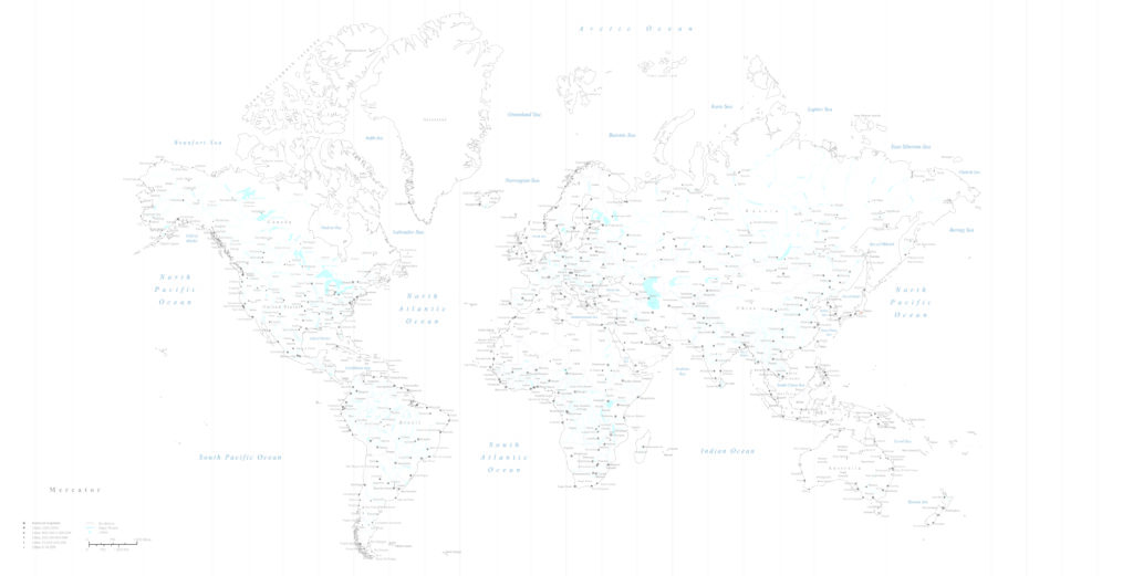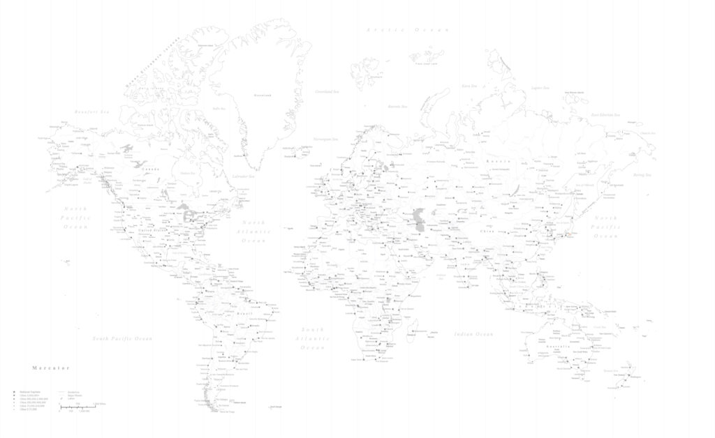 緻密な線画の世界地図(メルカトル図法)。推しの強くない繊細なデザインはオシャレなインテリアのアクセントクロスや、子供のための地球儀がわりに。 (掲載情報:国名、都市名(一定規模以上)、海洋名、河川名、湖名、国境線、経度線)